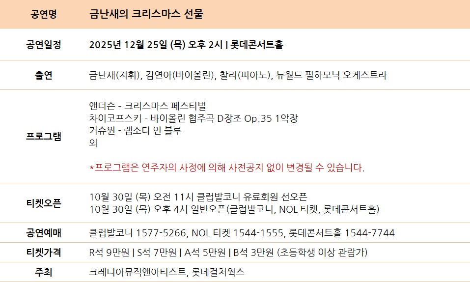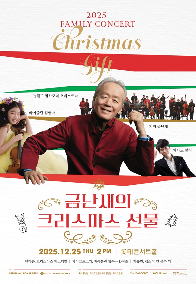 2025 패밀리 콘서트 <금난새의 크리스마스 선물>은 소중한 가족, 친구와 함께할 수 있는 공연으로 관객들에게 음악 이상의 깊은 울림과 크리스마스 선물을 전해줄 예정이며 2025년 12월 25일(금) 오후 2시 롯데콘서트홀에서 만나게 된다. 티켓 판매는 10월 30일(목)에 시작되며 티켓가 3-9만 원. 문의 크레디아 (02-318-4301)