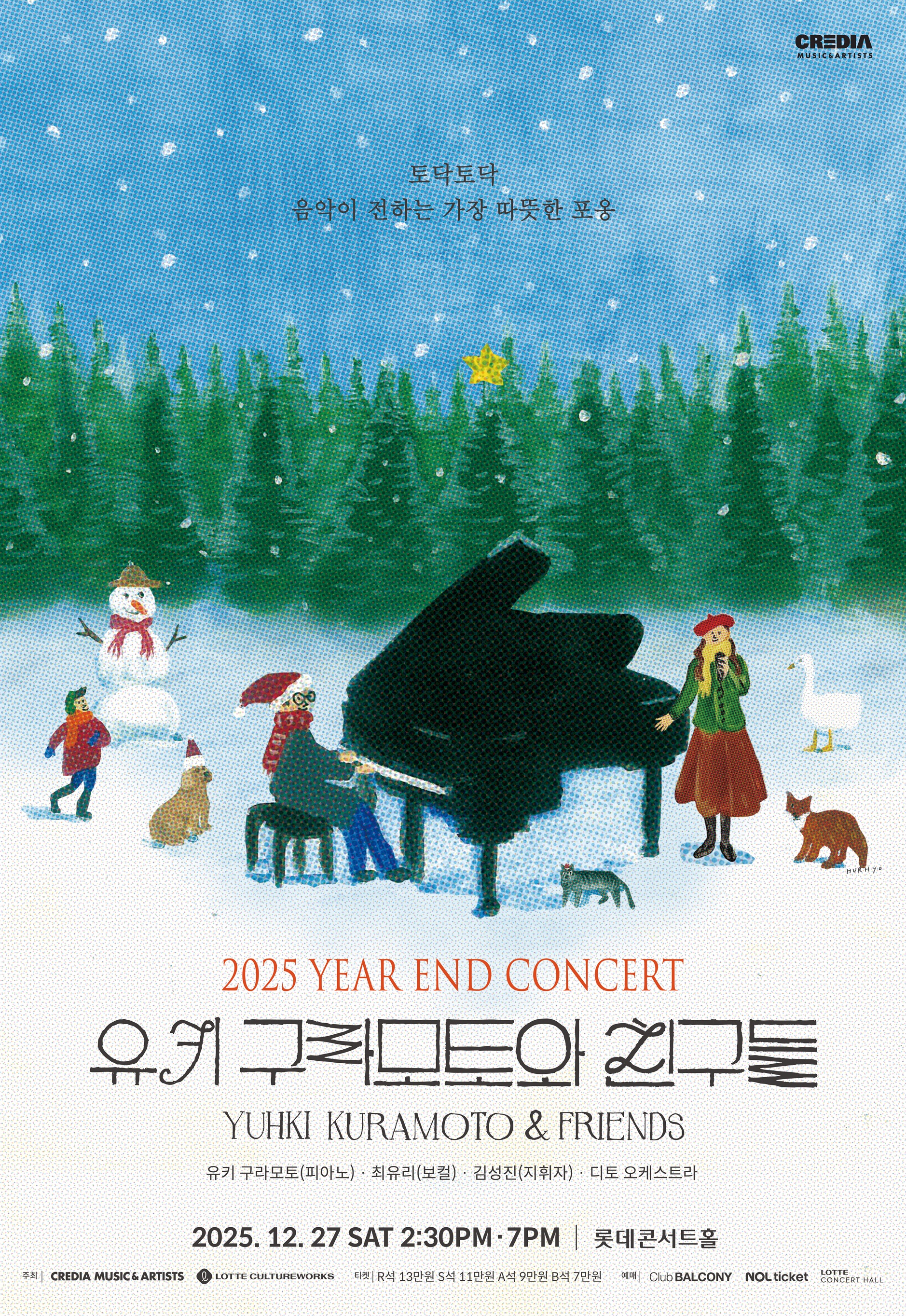연말 시즌 대표적인 스테디셀러 콘서트 <2025 Year End Concert - 유키 구라모토와 친구들>이 12월 27(토) 롯데콘서트홀에서 열린다. 매해 겨울, 유키 구라모토의 피아노는 관객들에게 따스한 위로를 전해오고 있다. 유키 구라모토와 친구들 공연에서는 유키 구라모토의 명곡들을 풀 오케스트라의 환상적인 사운드로 풍성한 감동을 전하며, 유키 구라모토만의 서정적인 편곡을 더한 크리스마스 캐럴 메들리 또한 놓칠 수 없는 포인트다.