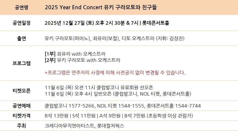 공감과 위로로 따뜻한 연말을 선물하는 ‘2025 Year End Concert 유키 구라모토와 친구들’ 공연 티켓은 11월 6일(목) 오후 4시에 오픈되며 클럽발코니 (1577-5266), NOL 티켓 (1544-1555), 롯데콘서트홀(1544-7744)에서 예매 가능하다. 티켓은 7-13만 원. |