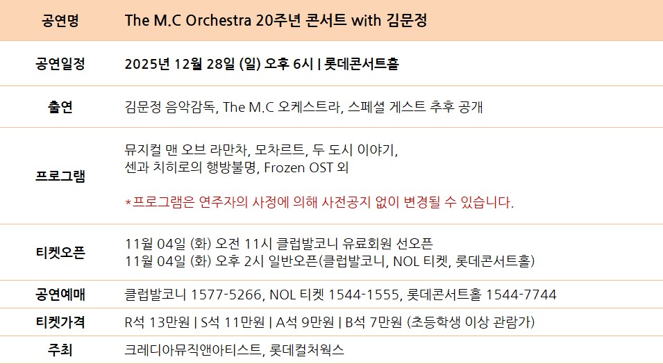 <The M.C Orchestra 20주년 콘서트 with 김문정>은 평소 뮤지컬에 관심 있던 관객들이라면 연말을 풍성하게 채워줄 수 있는 종합선물세트 같은 공연이 될 것이며 2025년 12월 28일(일) 오후 6시 롯데콘서트홀에서 만나게 된다. 티켓 판매는 11월 4일(화)에 시작되며 티켓가 13-7만 원. 문의 크레디아 (02-318-4301)