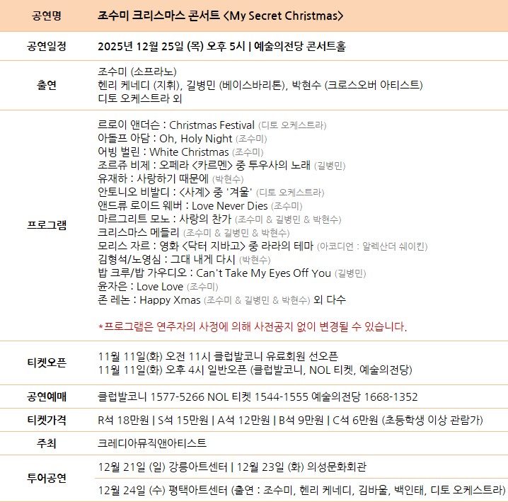 <조수미 크리스마스 콘서트 ‘My Secret Christmas’> 공연은 2025년 12월 25일(목) 오후 5시 예술의전당 콘서트홀에서 열리며, 티켓 판매는 11월 11일(화)에 시작된다. 티켓가 6만~18만 원. 문의 크레디아(02-318-4301) |