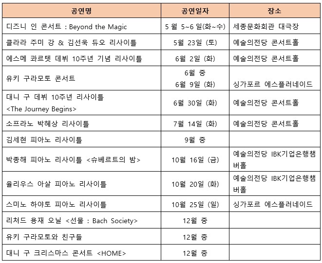 국내 클래식 팬들이 가장 기다려온 무대 중 하나인 클라라 주미 강 & 김선욱 듀오 리사이틀은 한국을 대표하는 두 거장이 한 무대에서 만들어낼 깊이 있는 음악적 교감으로 올 시즌 가장 큰 기대를 모으고 있습니다. 이어, 한층 업그레이드된 무대로 돌아오는 디즈니 인 콘서트 : Beyond the Magic이 시즌의 문을 열며, 세대를 아우르는 감동을 전할 예정입니다.